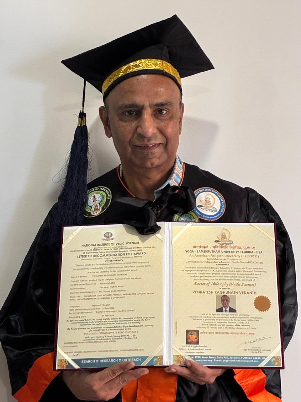 ಪ್ರಾಚೀನ ಭಾರತೀಯ ತತ್ತ್ವಶಾಸ್ತ್ರ ಮತ್ತು ಸಮಕಾಲೀನ ಹಣಕಾಸು ಆಡಳಿತದ ನಡುವಿನ ಆಳವಾದ ಹಾಗೂ ಅಪರೂಪದ ಸಂವಾದಕ್ಕೆ ಸಾಕ್ಷಿಯಾದ ಮಹತ್ವದ ಸಂಶೋಧನೆಗಾಗಿ ವೆಂಕಟೇಶ ವೇದಾಂತಿ ಅವರಿಗೆ ಡಾಕ್ಟರ್ ಆಫ್ ಫಿಲಾಸಫಿ (ಪಿಎಚ್.ಡಿ.) ಪದವಿ ಲಭಿಸಿದೆ.